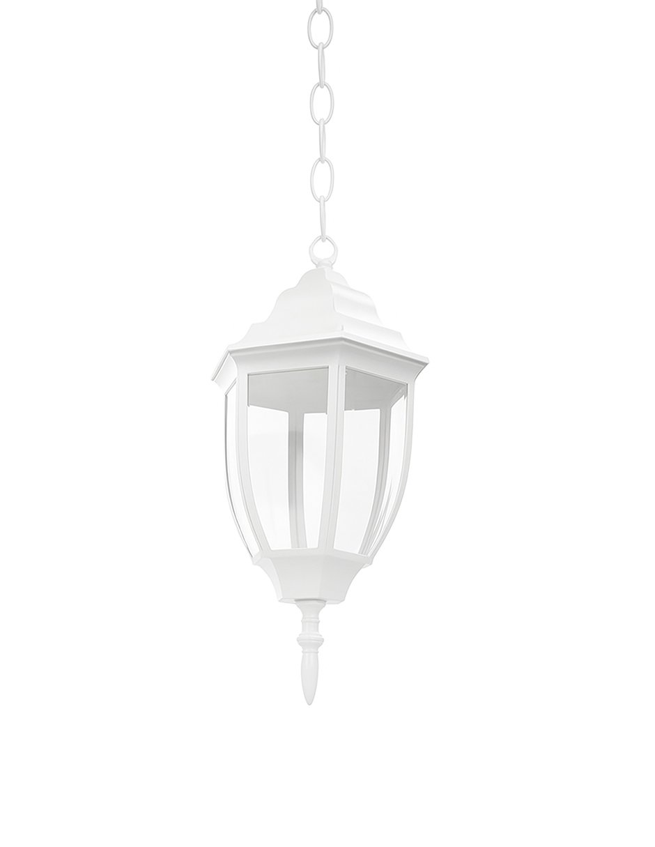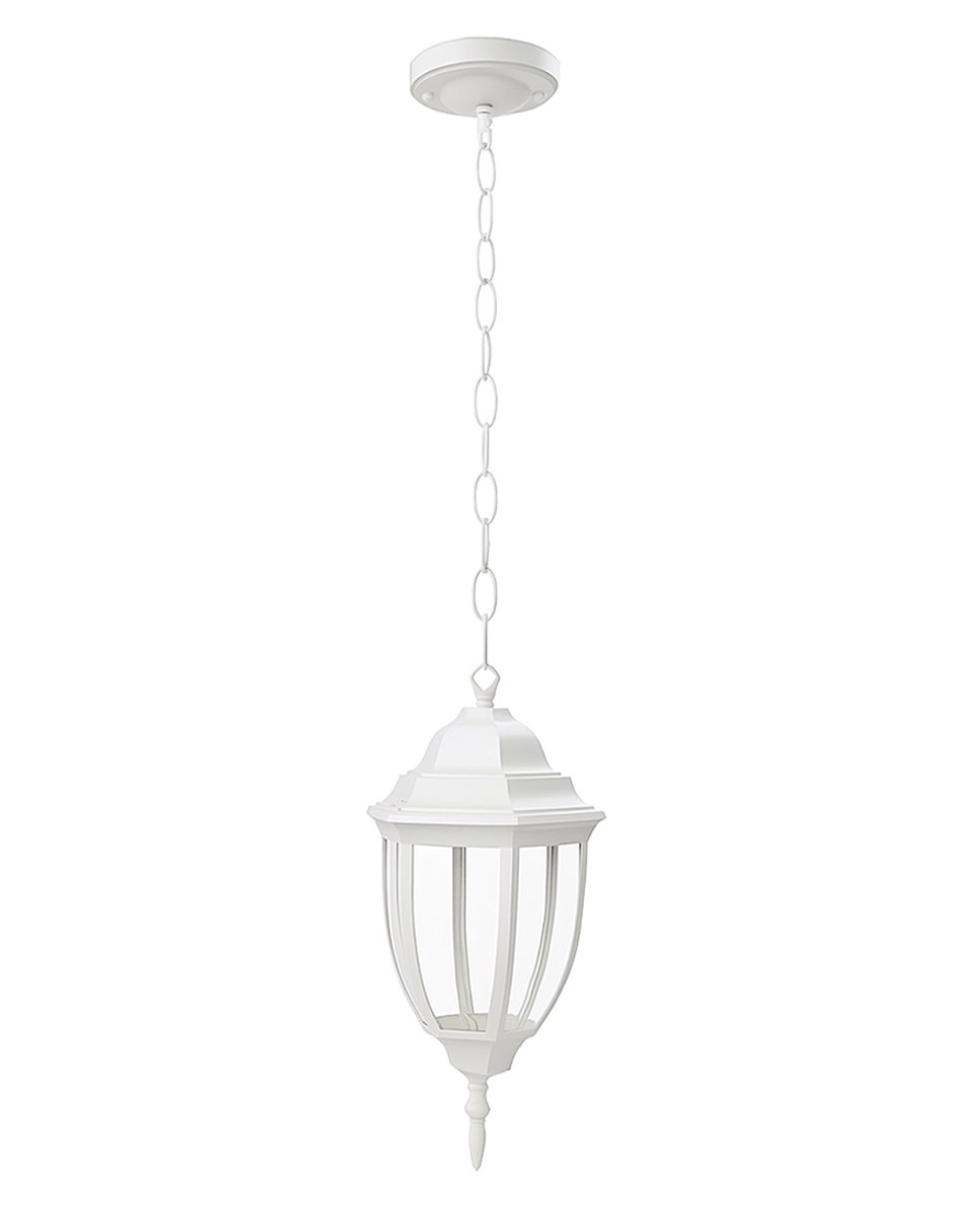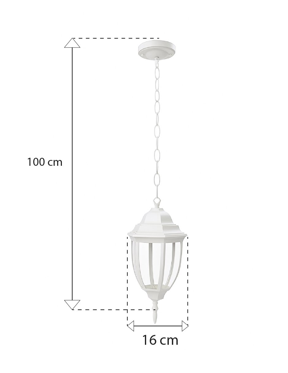 Colgante tipo farol ideal para iluminar y decorar interiores con estilo. Fabricado en metal y vidrio, cuenta con un acabado blanco que se adapta a espacios modernos, minimalistas o clásicos.