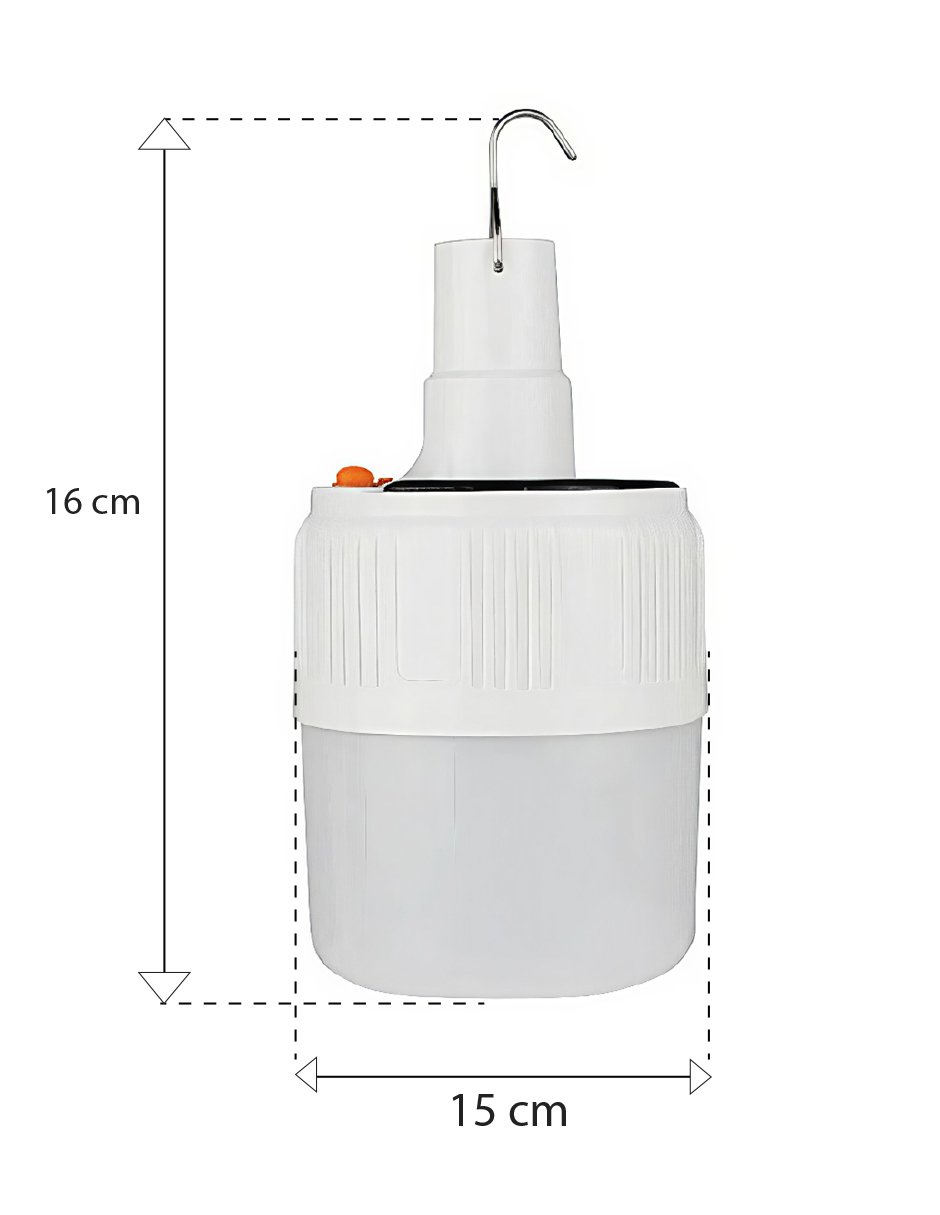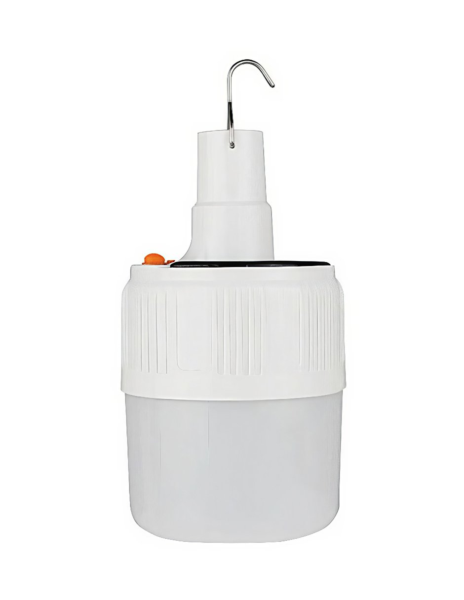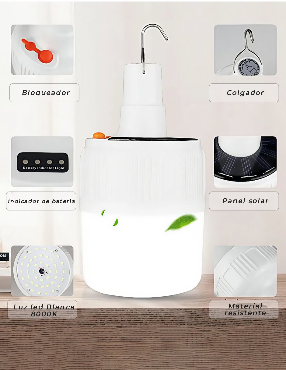 Foco LED solar recargable ideal para emergencias, campamentos o cortes de luz. Cuenta con panel solar integrado y entrada USB para carga directa. Emite luz blanca intensa a 8000K, con 45 watts de potencia, brindando alta luminosidad en cualquier entorno.