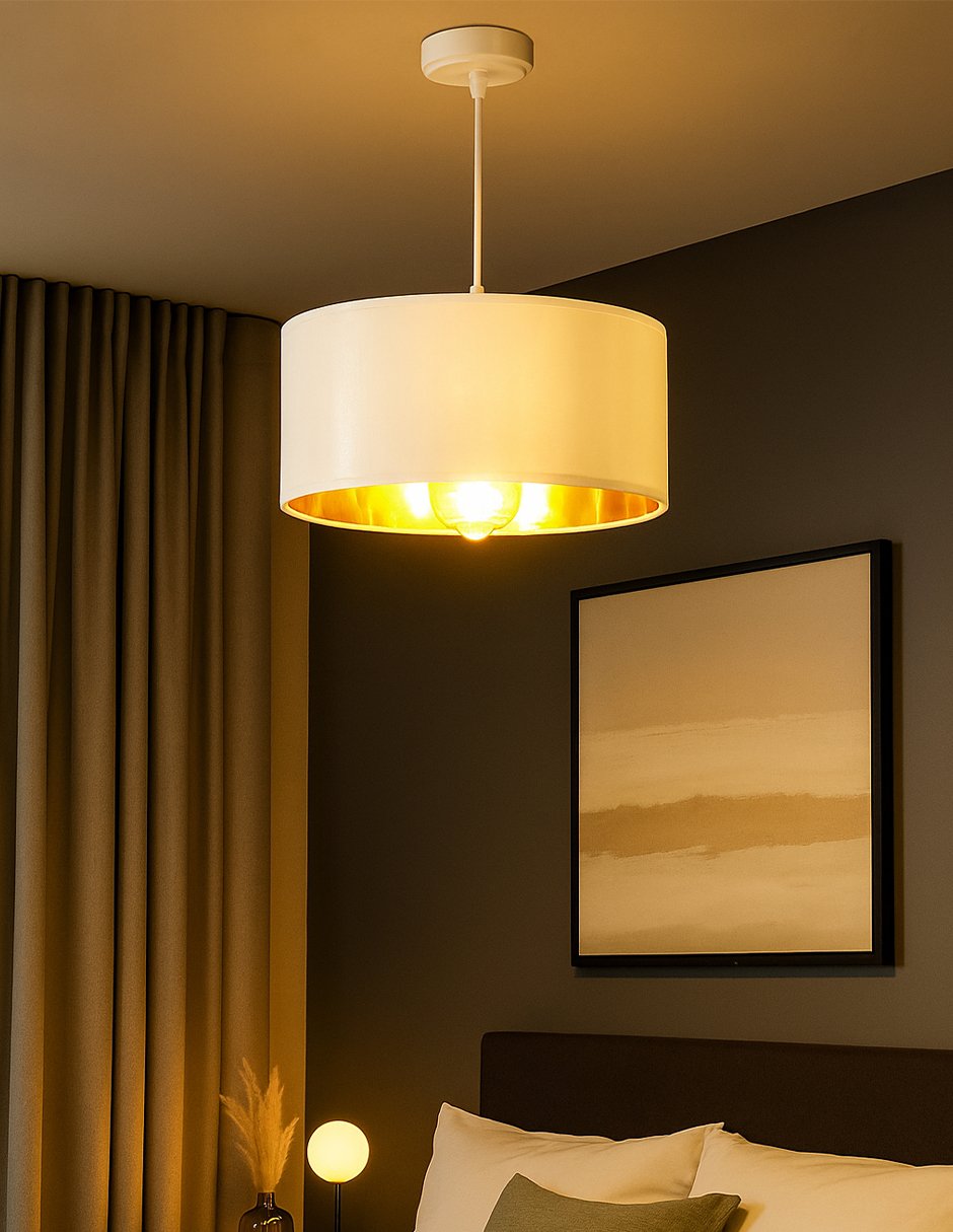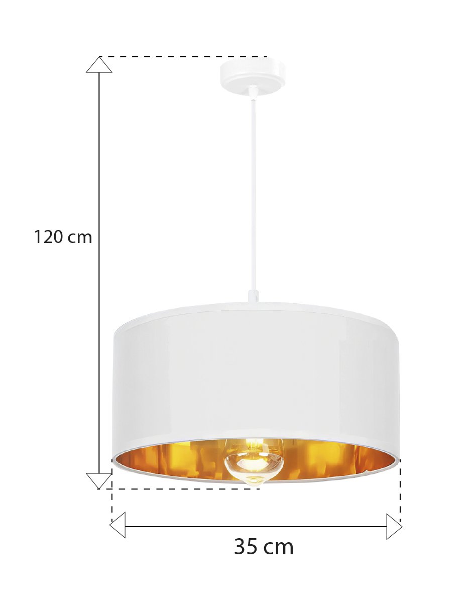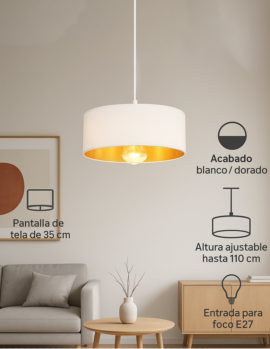 Lámpara colgante decorativa de diseño minimalista, ideal para dar un toque moderno y cálido a cualquier espacio. Su pantalla de tela blanca de 35 cm combina perfectamente con un elegante interior dorado que suaviza la luz y crea una atmósfera acogedora.