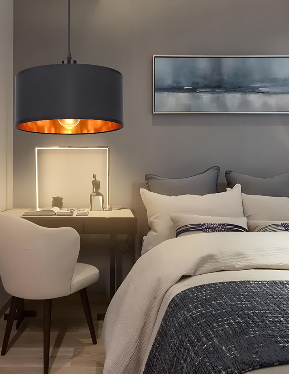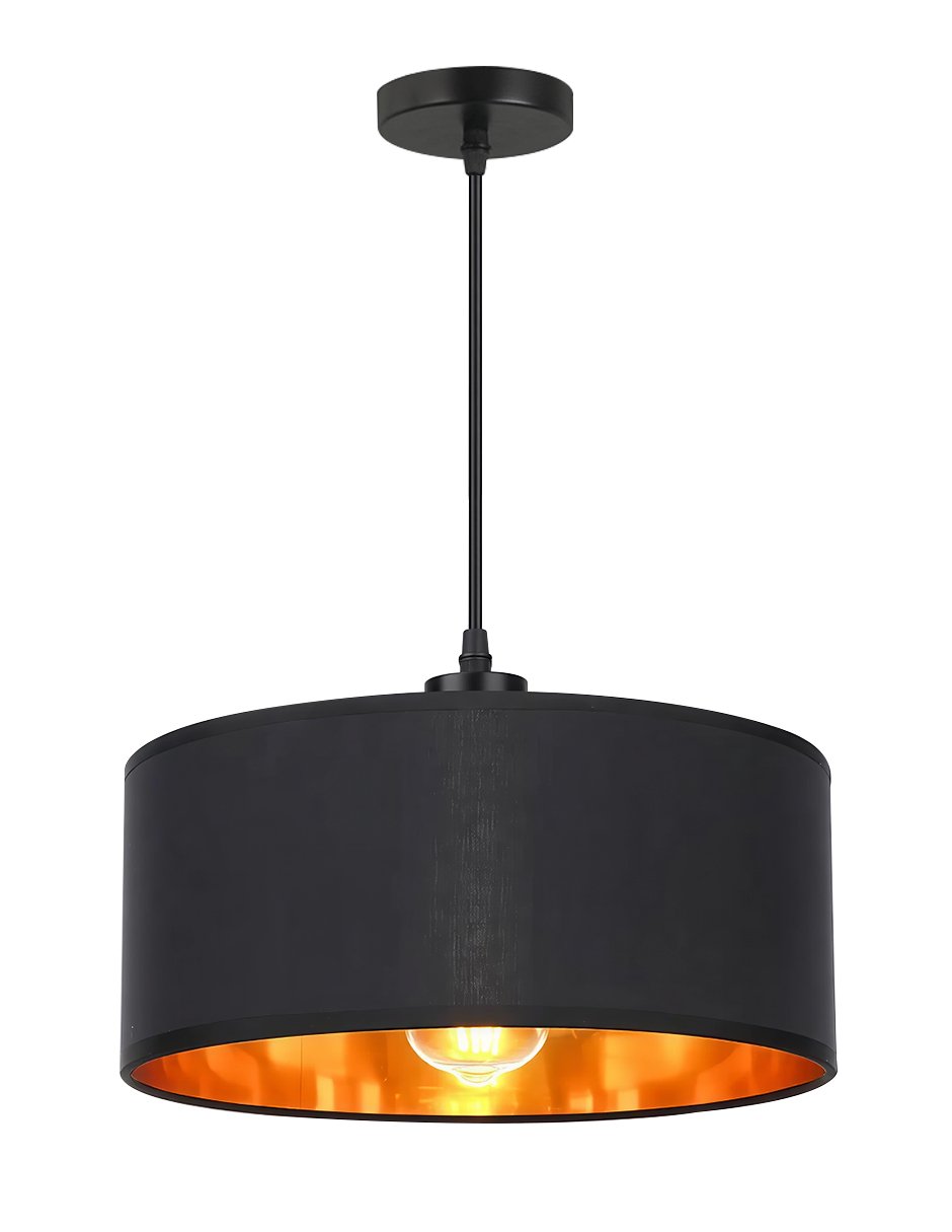 Lámpara colgante decorativa de estilo minimalista en elegante color negro. Su pantalla de tela de 35 cm de diámetro cuenta con un cómodo interior dorado que proyecta una luz cálida y envolvente, ideal para crear ambientes acogedores y modernos. Diseñada para adaptarse a distintos espacios, su altura es ajustable hasta 120 cm, lo que la hace perfecta para colocar sobre mesas, islas de cocina, barras, comedores o salas. El contraste entre el acabado negro mate y el interior dorado añade un toque de distinción y estilo contemporáneo. Cuenta con entrada para foco E27 tradicional, compatible con focos LED o ahorradores (no incluidos). Características destacadas: Pantalla de tela negra con interior dorado Diámetro: 35 cm Altura regulable hasta 120 cm Entrada estándar para foco E27 Estilo moderno, minimalista y versátil Ideal para comedor, sala, cocina o estudio Fácil de instalar