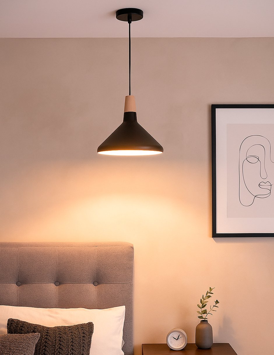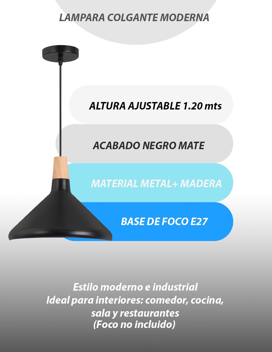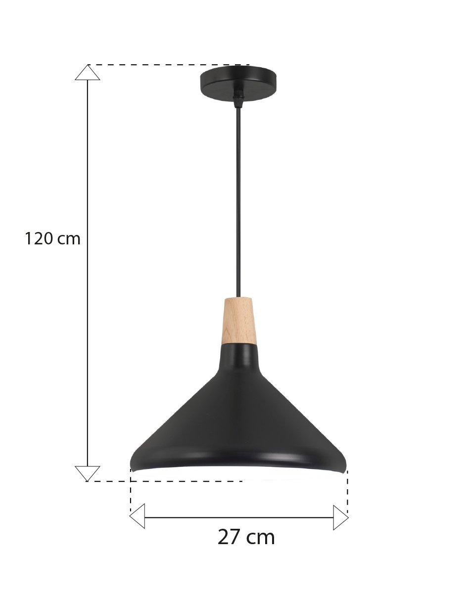 Su diseño funcional incluye un cable ajustable de hasta 1.2 metros, lo que permite adaptarla fácilmente a distintos tipos de techo o necesidades de altura. Compatible con foco E27 (no incluido), ofrece versatilidad para elegir entre luz cálida, neutra o fría según el ambiente deseado.