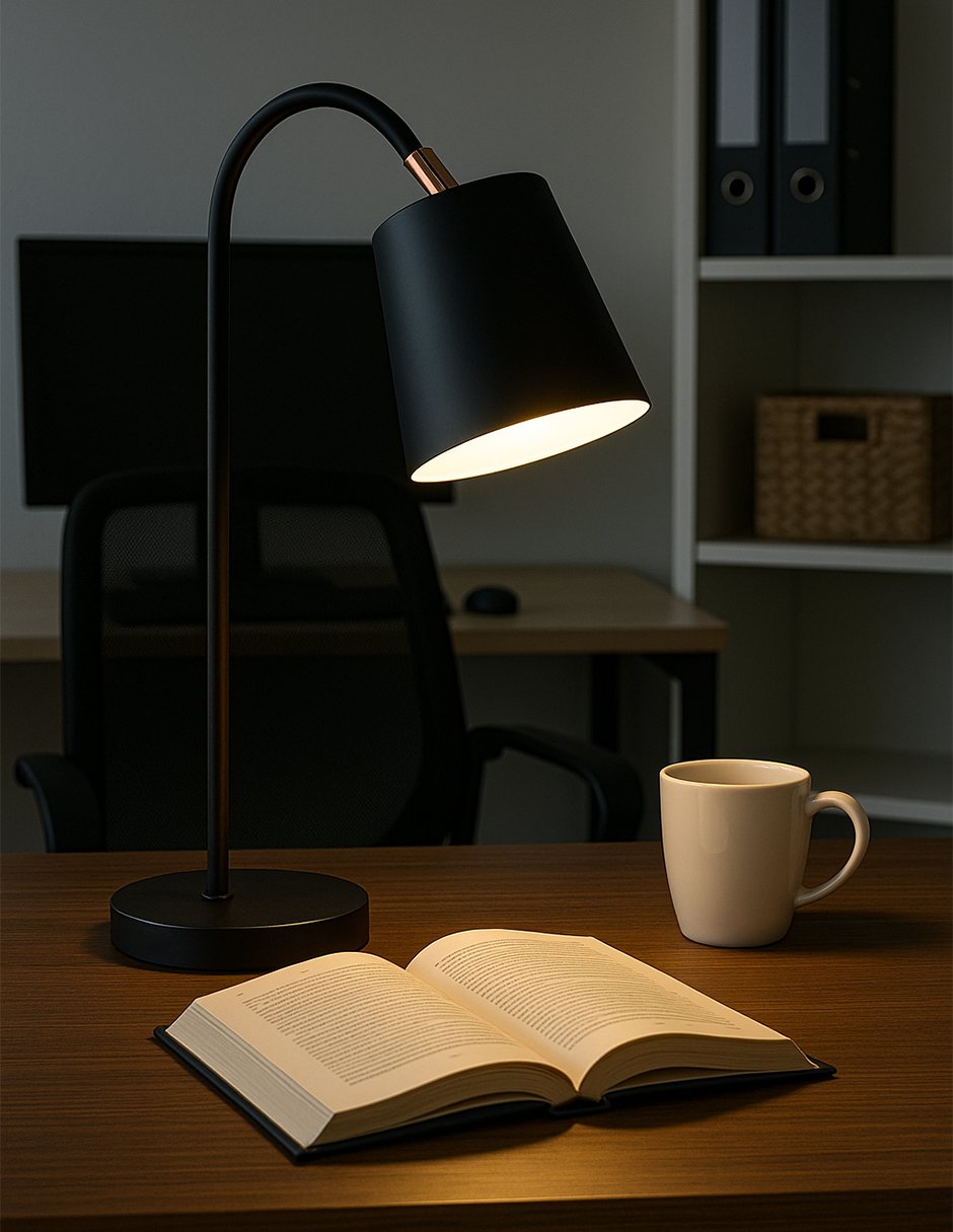 Lámpara de buró de diseño moderno y elegante, ideal para recámaras, salas de estar u oficinas. Cuenta con apagador integrado para mayor comodidad. Fabricada en metal fino con acabado negro, combina durabilidad y estilo en cualquier espacio. Características del producto: Alto: 45 cm Largo: 24 cm Longitud del cable: 1.5 m Material: Metal fino Color: Negro Tipo de foco: Base E27 (foco no incluido) Apagador incluido Práctica, decorativa y funcional. Perfecta para iluminar tus noches con estilo.