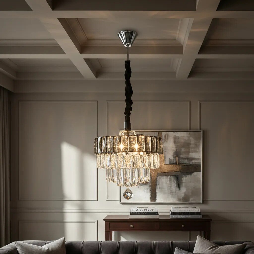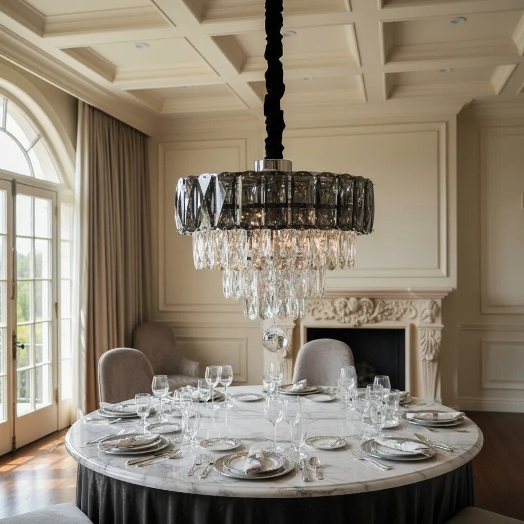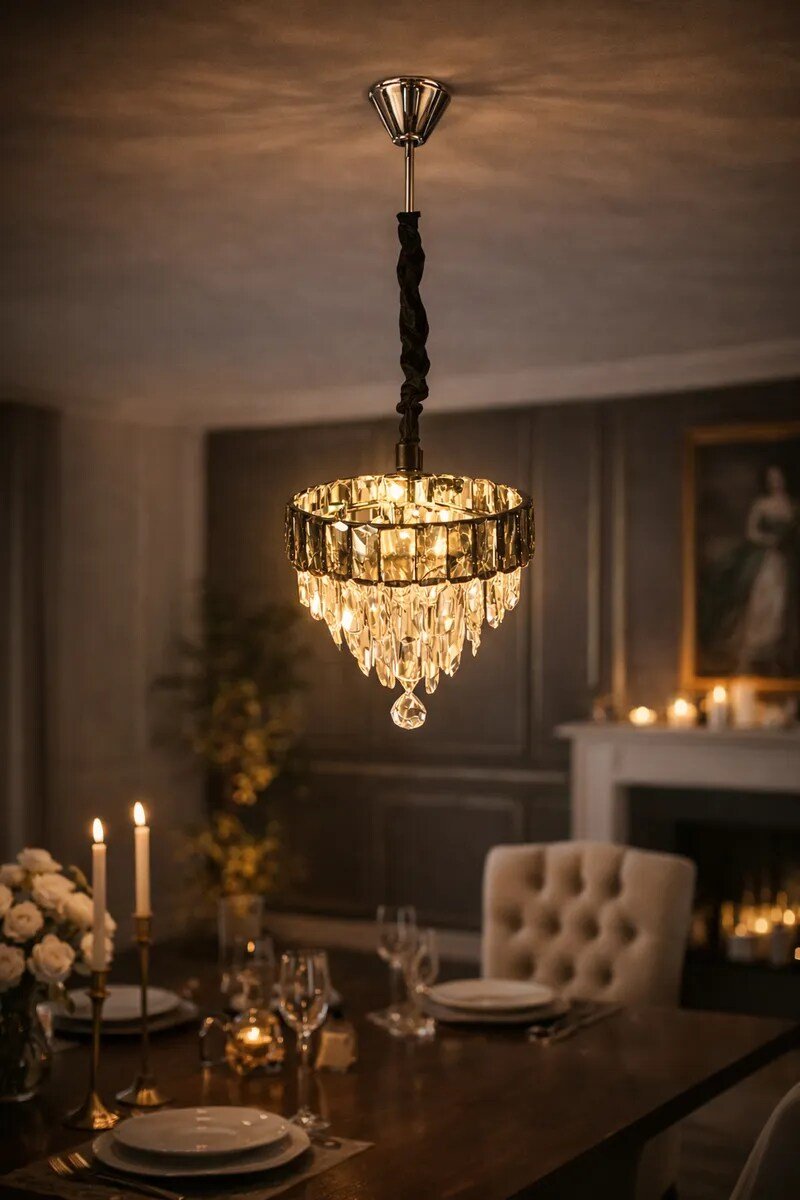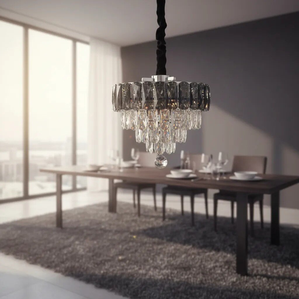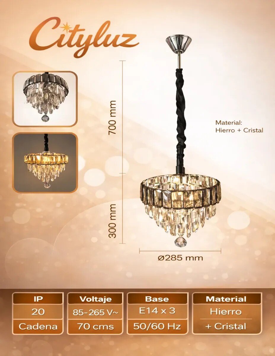 Lámpara colgante CityLuz con diseño elegante y moderno, ideal para salas, comedores, recibidores o espacios comerciales. Fabricada en hierro con cristal cortado que brinda un acabado sofisticado y excelente dispersión de luz.