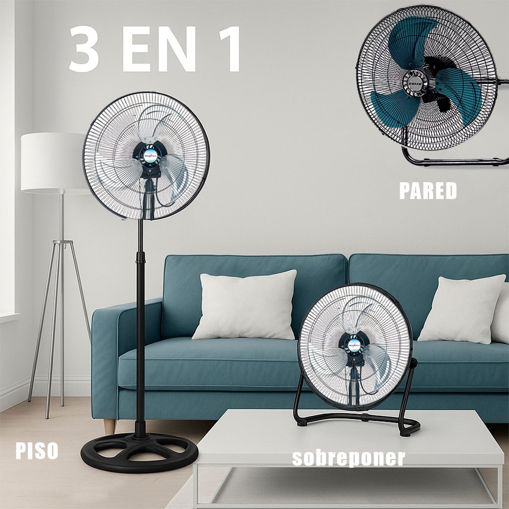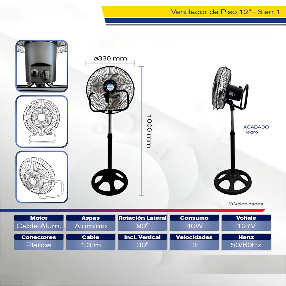Ventilador 3 en 1 CityLuz de 12» es la solución perfecta para mantener tu espacio fresco y agradable durante todo el año. Este ventilador multifuncional te ofrece la flexibilidad de usarlo como ventilador de pedestal, montarlo en la pared o colocarlo sobre una mesa como ventilador de sobremesa, adaptándose a tus necesidades y al espacio disponible. Su diseño 3 en 1 te permite maximizar su uso en cualquier ambiente, ya sea en el hogar o la oficina. Con 3 velocidades de aire ajustables, podrás controlar la intensidad del flujo de aire, eligiendo la opción que mejor se adapte a la temperatura y comodidad que buscas en cada momento. Las aspas de aluminio, además de ser duraderas y resistentes, proporcionan una ventilación potente y eficiente, asegurando que el aire llegue de manera uniforme a todas las áreas de la habitación. El cabezal con rotación de 90 grados permite que el aire se distribuya de forma más amplia, enfriando todo el ambiente de manera rápida y eficaz. También cuenta con un cable de 1.23 metros, lo que te brinda mayor libertad para ubicar el ventilador en el lugar que prefieras sin restricciones de espacio. Este ventilador es ideal para refrescar cualquier habitación, ya sea en días calurosos de verano o para ventilar el aire en espacios cerrados. Su diseño moderno y funcional lo convierte en una opción perfecta para aquellos que buscan comodidad, rendimiento y versatilidad en un solo producto.