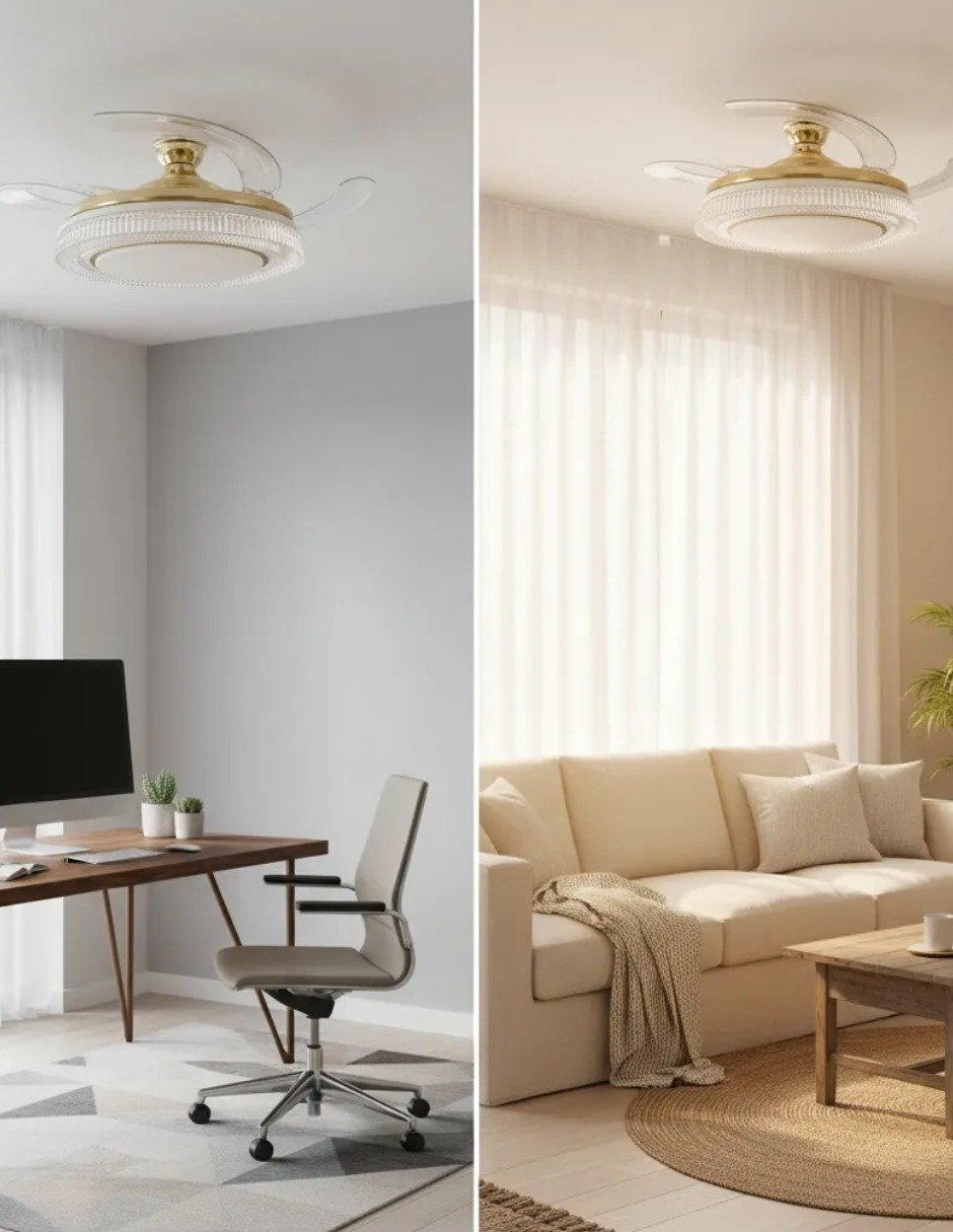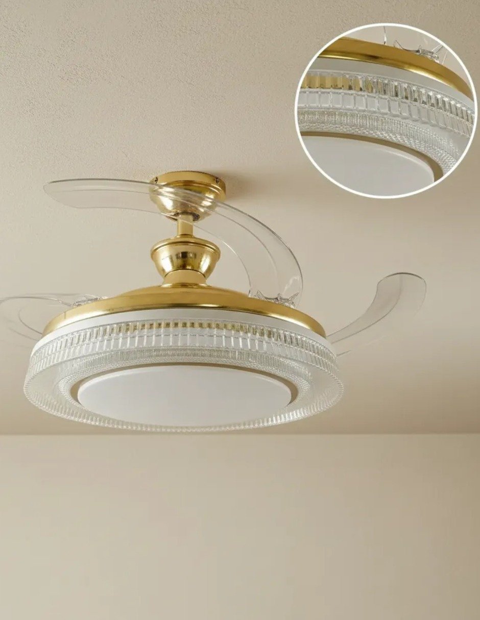 Ventilador de techo reversible modelo Makira marca CityLuz, con aspas retráctiles que se ocultan cuando no están en uso, brindando un diseño moderno y elegante. Ideal para sala, comedor o recámara.