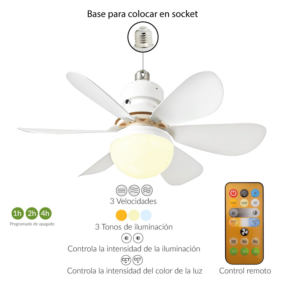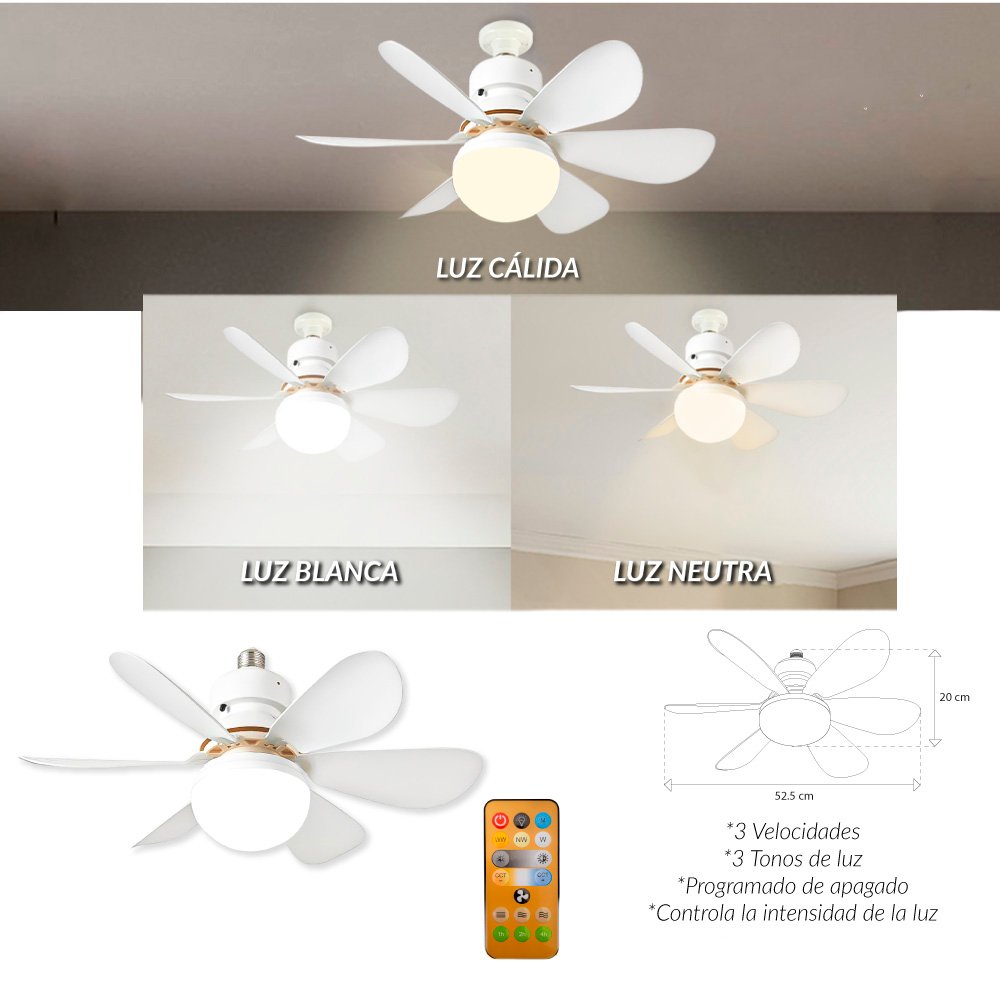 Transforma tu hogar con esta Lámpara LED Ventilador que ofrece todo lo que necesitas para una iluminación perfecta y una brisa fresca! Con 5 aspas de alto rendimiento y 3 velocidades de aire, podrás ajustar la intensidad del ventilador para mantener tu espacio cómodo y fresco en todo momento. Características principales: 5 aspas que garantizan un flujo de aire eficiente para refrescar cualquier habitación. 3 velocidades de aire para que adaptes la intensidad a tus necesidades. 3 temperaturas de luz: cálida, neutra y fría, perfectas para crear el ambiente ideal en tu hogar. Dimable: ajusta la intensidad de la luz para un ambiente suave y relajante. Consumo de 48W, eficiente en energía sin sacrificar el brillo necesario. Voltaje de 85-265V, compatible con la mayoría de las instalaciones. IP 20: protección adecuada para su uso en espacios interiores. Fácil instalación: reemplaza tu foco tradicional E27 en minutos, solo quita el foco antiguo y coloca esta lámpara. Con un diámetro de 45 cm y 19 cm de altura, este ventilador-lámpara es ideal para cualquier espacio, ya sea en el salón, dormitorio o oficina. Además, el control remoto incluido hace que su uso sea súper cómodo para ajustar la luz y la velocidad del ventilador sin moverte. ¡No esperes más y dale un toque de modernidad y funcionalidad a tu hogar con esta Lámpara LED Ventilador!