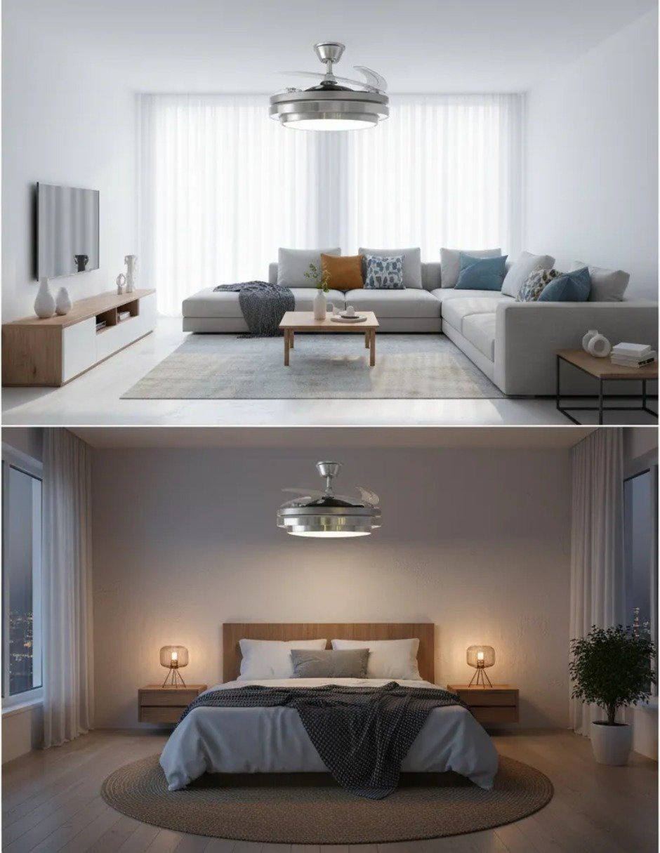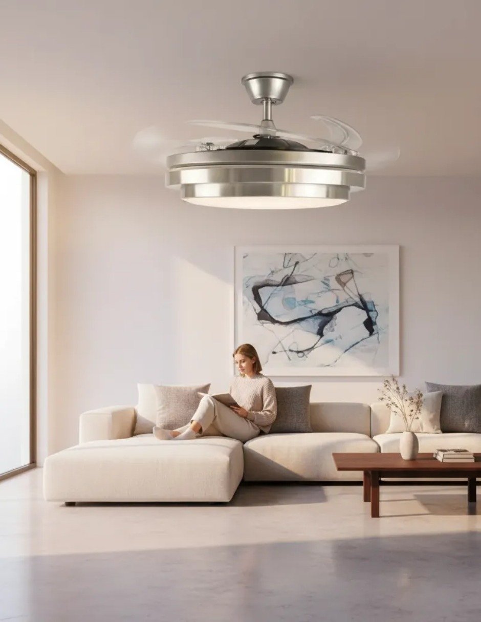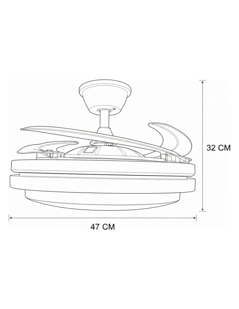 Cuenta con 6 velocidades de ventilación que permiten ajustar el flujo de aire con precisión, ofreciendo funcionamiento silencioso y eficiente. Su diseño compacto combina lámpara y ventilación en un solo equipo, ayudando a ahorrar espacio y consumo eléctrico mientras aporta un toque decorativo contemporáneo.