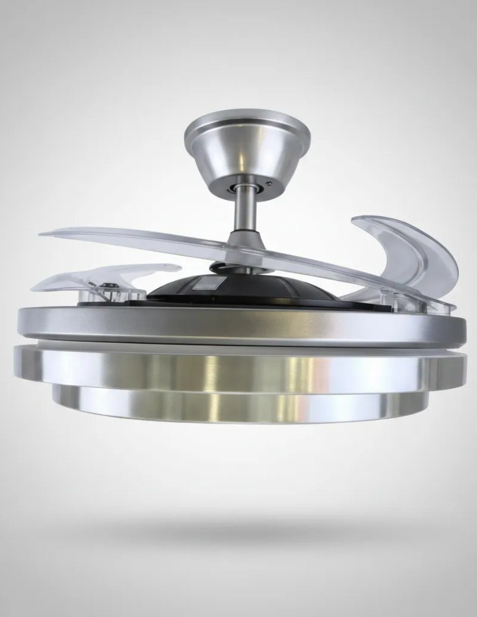 Ventilador de techo Cityluz modelo Jam con diseño moderno y elegante en acabado cromo, ideal para salas, recámaras u oficinas. Integra iluminación LED de 72W con luz atenuable y 3 temperaturas de color (cálida, neutra y fría) para adaptar el ambiente según la ocasión.