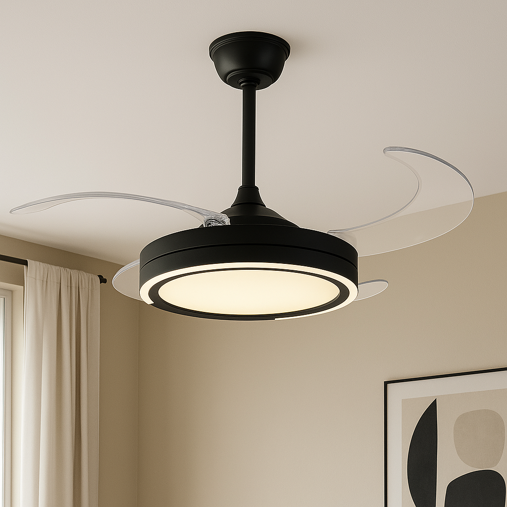 Ventilador de Techo con Control Remoto – 6 Velocidades, 3 Temperaturas de Luz y 4 Aspas Transparentes ¡Transforma tu hogar con el ventilador de techo ideal para disfrutar de frescura y confort sin renunciar al estilo! Este ventilador de techo con control remoto es perfecto para quienes buscan comodidad y un diseño moderno. ¡Ajusta la velocidad del aire y la temperatura de luz de acuerdo a tu gusto, creando el ambiente ideal en cada momento! Características destacadas: 6 velocidades de aire para que siempre tengas la intensidad perfecta según el clima y tu preferencia. 3 temperaturas de luz: cálida, neutra y fría, para adaptar la iluminación según la ocasión. Dimable: regula la intensidad de la luz con facilidad para crear ambientes suaves o brillantes en segundos Consumo de 72W , eficiente en energía, sin perder luminosidad. Voltaje de 85-265V , compatible con diferentes instalaciones. 4 aspas transparentes para un flujo de aire eficiente y un diseño único Temporizador y velocidad variable, ajusta la configuración a tu necesidad, creando un ambiente personalizado. IP 20: ideal para uso interior, resistente a la humedad y el polvo. Con un diámetro de 100 cm con aspas abiertas y 48 cm con aspas cerradas, esta lámpara ventilador es ideal para espacios grandes o medianos. Su altura de 52 cm le permite adaptarse perfectamente a cualquier habitación, desde el salón, el dormitorio hasta la oficina. El acabado blanco y negro le da un toque de elegancia moderna que se adapta a cualquier estilo decorativo. ¡Mejora la comodidad y el estilo de tu hogar con el Ventilador de Techo con Control Remoto!